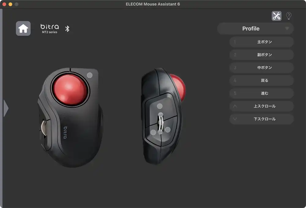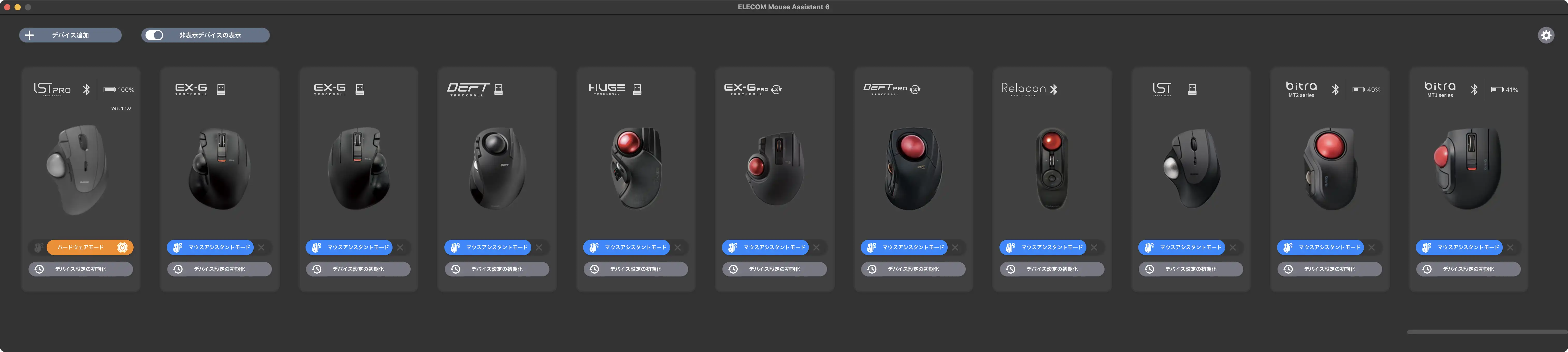 25年1月、プログラマブル機能に対応したフラッグシップ親指機IST PROの登場に合わせて、エレコムマウスアシスタント6が登場しました。上画像は登録した機種の表示画面で、ここからカスタムしたい機種を選んで詳細設定に入ります。マウスアシスタント6公開当初、bitraは既に鬼籍に入っていたこともあってか非対応機種でしたが、その後追加されました(画像一番右端の2つ)こういうのは本当に嬉しく、ありがたいものです。